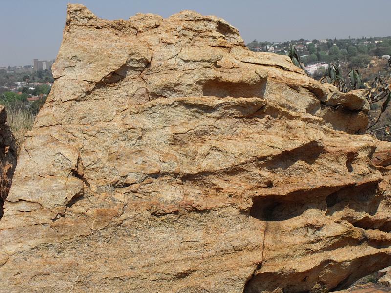 Melville Koppies GeologyMelville Koppies lies on the Kaapvaal craton, one of the earliest known pieces of the Earth's crust. It took about a billion years for the molten planet to begin to form chunks of stable crust, which we call cratons, and which form the nuclei of later tectonic plates and continents. At 3.5 billion years old the Kaapvaal Craton was one of the earliest. Roughly 1.2 million square kilometers in area, it underlies much of Southern Africa as we know it today, stretching from the Barberton mountain land in the East to beyond Gaberone in the West; from the Limpopo in the North to the Free State in the South. It is probably related to the Pilbara Craton, on the west coast of Australia, for the two areas were one at the time. The oldest rocks are exposed near Barberton, and are only rivalled by rocks of a similar age in Greenland. Very ancient granitic rocks of the craton underlie northern Johannesburg, and are exposed as far as Midrand. Examples can be seen in the Montgomery Spruit and the Braamfontein Spruit. Here and there are remains of even older greenstone, visible in Linden, at Emma Park, for example. By about 3.1 billion years ago the craton had sagged, forming a basin to the south of what we think of as the Witwatersrand. This basin filled with water. To the west, north, and east of the basin a range of mountains sent sediment in vast quantities into this inland sea. The only form of life then on earth was prokatyotic bacteria, the rain was more like acid rain than the rain we know today, and so there was little to prevent the eroding mountain ranges from sending torrents of gravel, sand, and mud down to this sea. In a wide arc extending from today's Leander in the east, through the Witwatersrand, and south west to Welkom, the remains of the ancient sea shores are found. Over a period of three hundred million years or more, the mountains weathered into huge river deltas, and coastal sediments built up to a depth of about seven kilometres. These sediments were layered and differed depending on the circumstances of their deposition - layers of coarse pebbles deposited upstream, slightly less coarse sand forming beaches, and finally silt, deposited in deep and calm waters. These sediments lithified (became stone) in the form of conglomerate, quartzite, shale, and siltstone. The Melville Koppies lies at the base of these sediments. In other words it represents the first sea shores and shallow beds of the ancient sea. It also forms part of the lowest level of one of the world's most well known geological features, the Witwatersrand Supergroup. Several fairly narrow layers of gravel, deposited quite late in the sequence, and bearing heavy elements, made the Witwatersrand Supergroup famous. These are the gold-bearing conglomerates of the main reefs.