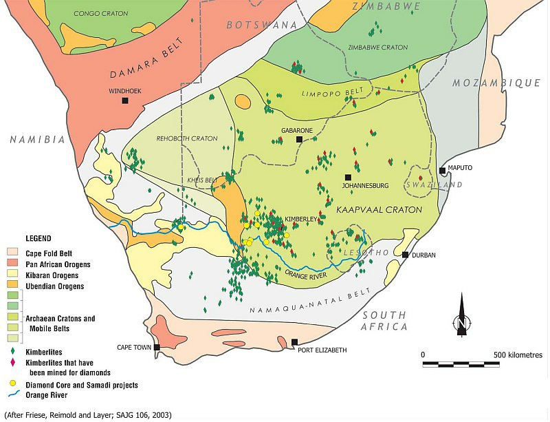 bottom right is the area of smashed granite - schistoid rock. In one place on the Koppies you can see where the lowest level of the Orange Grove Quartzite lies upon the granitoid basement. This is the "unconformity". The basement rocks are far older than the quartzite - by about four hundred million years - and whatever geological processes happened in that length of time - presumably a long period of erosion - are irretrievably lost. The place where the two rock types meet shows that a period of violent tectonic action took place at some later time, thrusting the sedimentary rock against the basement, shattering the granite. The result is a layer, about 10cm wide, of crushed granite, technically called schist. This phenomenon is only to be seen at two other sites in Johannesburg: others are unknown, lost below buildings. Another feature of the Koppies is the abundance of quartz veins. Quartz was formed in the deep crust by hydrothermal action - the violent explosion of liquid trapped in deep layers, under conditions of great heat and pressure, leaching silicon dioxide from the silica rich quartzite. The veins vary from tiny seams only millimetres thick, to layers nearly a meter wide. Tectonic forces over the millions of years have largely shattered the quartz veins, meaning that the Koppies are covered with small milky white pebbles. Finally, there is a completely different formation in the stream bed. Here, in the fault through which Beyers Naude Drive now runs, there is an intrusion of igneous rock - Gabbro or Dolerite (the difference is one of grain size, not chemical composition) which thrust up into the crust and cooled far below the surface about two billion years ago. It is probably associated with the huge volcanic activity which created the Bushveld Igneous Complex. Thus the Melville Koppies represents in microcosm most of the features of the Witwatersrand Supergroup. What it does not have is gold-bearing rock. This occurs millions of years, and several kilometres, higher up in the sequence. The early owners, the Geldenhuys family, discovered this, to their regret. Sources: Norman N and Whitfield G, 2006 Geological Journeys,