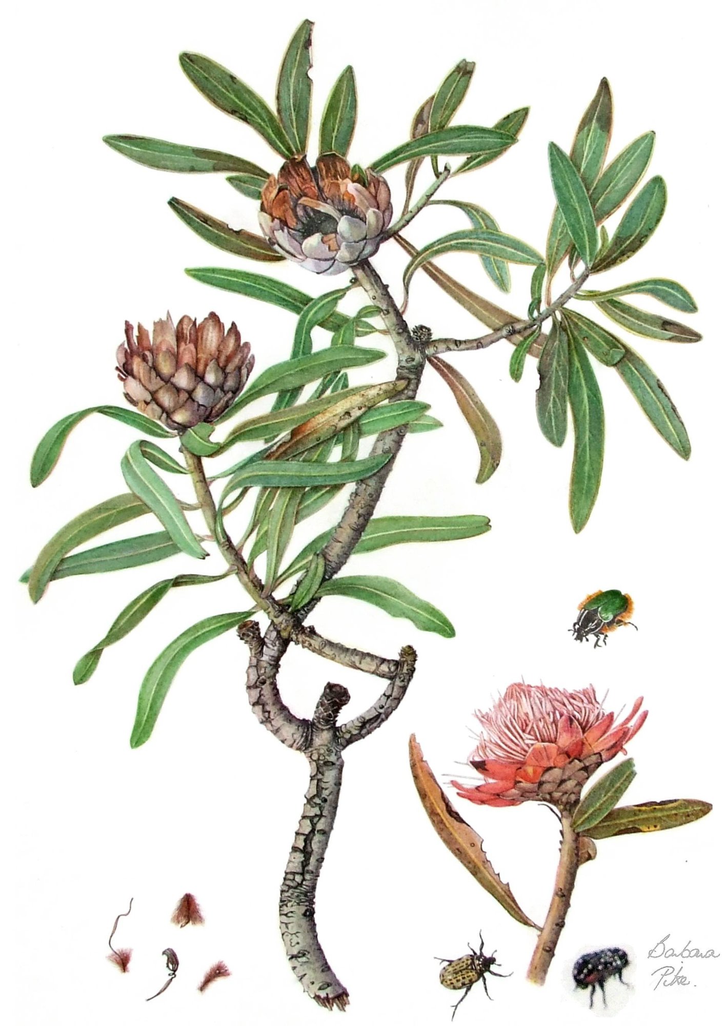 Barbara Jeppe. An illustration of a Protea caffra flower head and a small sketch to show the typical shape of the tree Botanical art was used long ago, before the advent of photography, to illustrate plants for identification. Botanical artists need patience, keen observation of form and colour, a knowledge of the botanic structure of plants, skill and talent. Outstanding botanical artists have an additional artistic flair, often translating this into saleable art collectables. Two well-known South African botanical artists have illustrated the flora of Melville Koppies for guide books. In 1964, the late Barbara Jeppe illustrated 'Trees and shrubs of the Witwatersrand', compiled by The Tree society of Southern Africa in a limited edition of 400 copies. Her meticulous line drawings and water colours make plant ID so easy for those fortunate to have copies of the book! Her daughter, Leigh Voigt, is also an outstanding botanical artist.