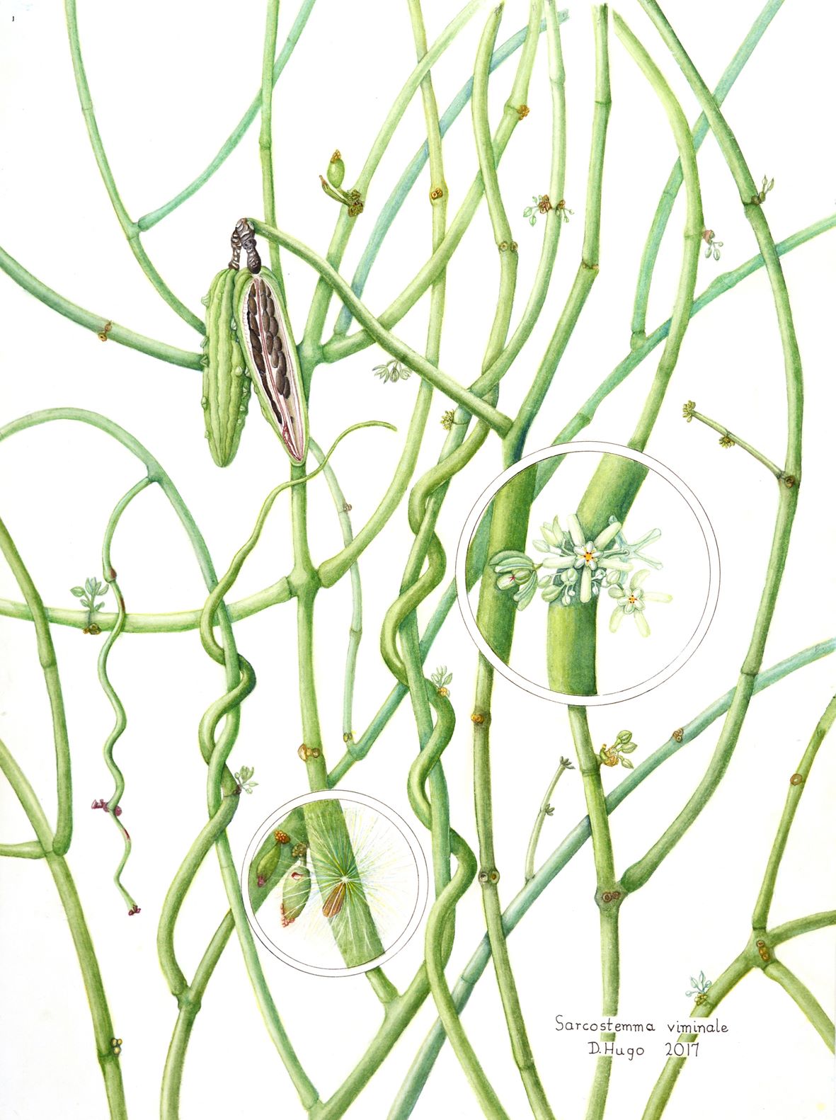 Botanical artist, Jackie Hugo's water colour of a Milky rope. Note the dainty creamy yellow flowers, seed pod, random nodes and twinings. This painting was on display at the 2018 Botanical art world exhibition. In her gardening page, Kay Montgomery once suggested the vigorous-growing leafless Sarcostemma viminale (Milky rope) for a garden creeper. I invited her to Melville Koppies to see what 'vigorous', if uncontrolled, can mean. In very secluded patches of the reserve, we discovered monstrous, impenetrable thickets of Milky rope blanketing and smothering supporting trees. Another conservation nightmare to deal with! The creeper can grow from a seed or a piece of creeper simply stuck in the ground. A thin, green, leafless 'snake' then emerges, in an involuntary support bush or tree. The 'snake' anchors itself by many twinings around a branch. From this base, it sends out more snaky stems which continue to divide and twine from random nodes. It has been a Sisyphean task to remove the bulk of these infestations. Frequent follow-up is needed to control this latex-oozing creeper. The milky white latex of this creeper of the Asclepiadaceae family is a mild irritant that spatters the workers' overalls with white dots. Fortunately it is not like the toxic, fiery latex of the Euphorbiaceae family, especially the Euphorbia tirucalli (Fire sticks, Coral bush) so favoured by gardeners. Day 14: Keeping in touch Wendy Carstens