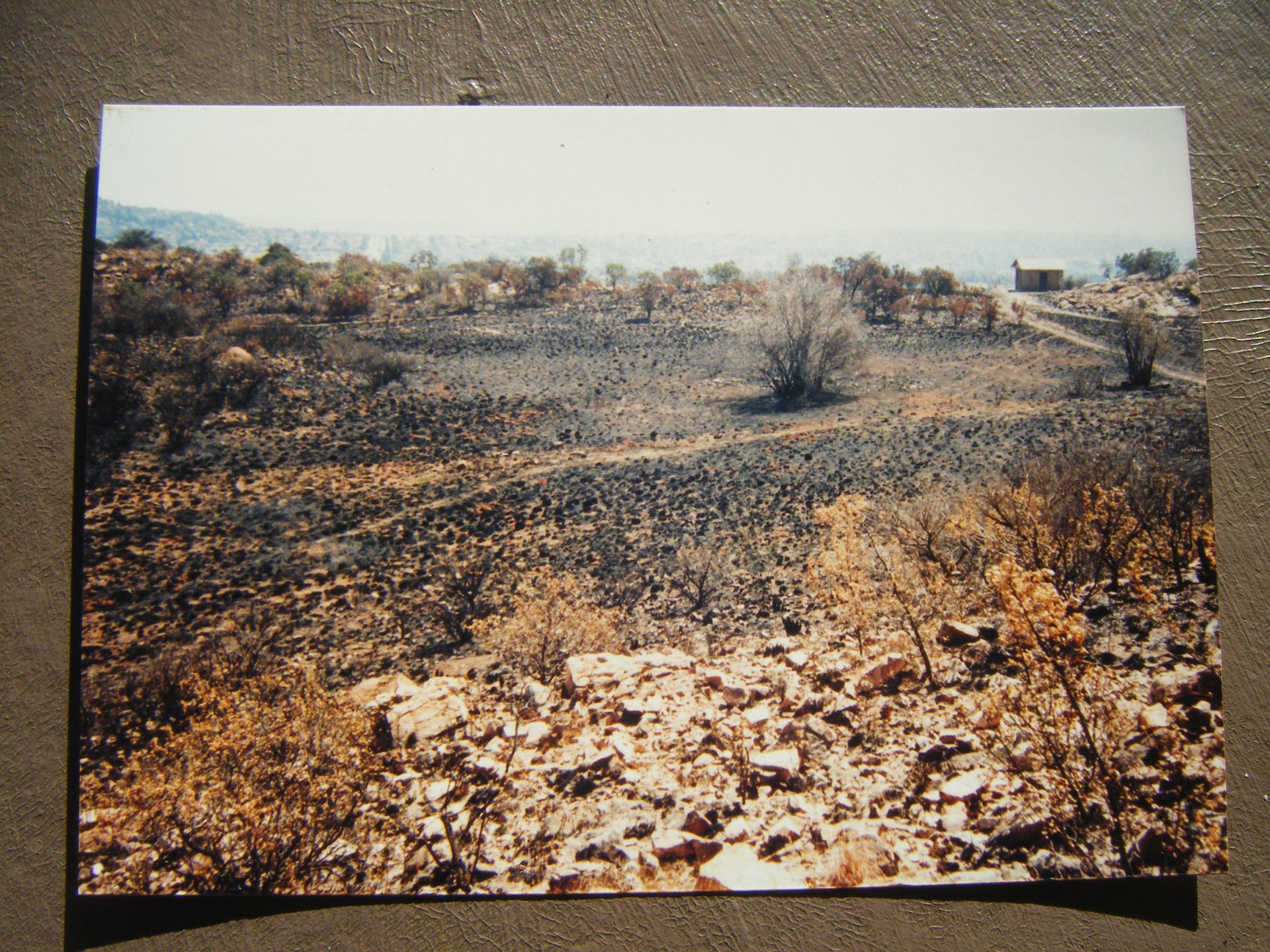 A photo taken after a fire on Melville Koppies Central in 1996. Notice the ugly little guard hut on the top right of picture. The area above the path in the foreground is now a forest of Proteas. The fire department used to send a land cruiser to monitor the fires. It did more damage than the fires (see the tracks). Tweet! tweet! Tweet! The alarm whistle! Vandals had severely damaged the guard hut. David Mpilo, the lone JCP* worker assigned to Melville Koppies, was frantically calling for Richard Hall, the volunteer conservation manager. Whistles were the only means of communication back in 1998. ![]() Richard Hall with the vandalised guard hut in the background. This photo was in the Northcliff and Melville Times, 21st August 1998. Note the square-cut rocks and the concrete base. I think that Richard may have been secretly pleased at this particular act of vandalism. The lone guard hut, with no facilities, was perched on a ridge in the middle of the Koppies. It was an eyesore. It was empty because no guards were assigned to the Koppies. Richard was convinced that strange sects used the hut at night because of the pentagons painted on the walls.