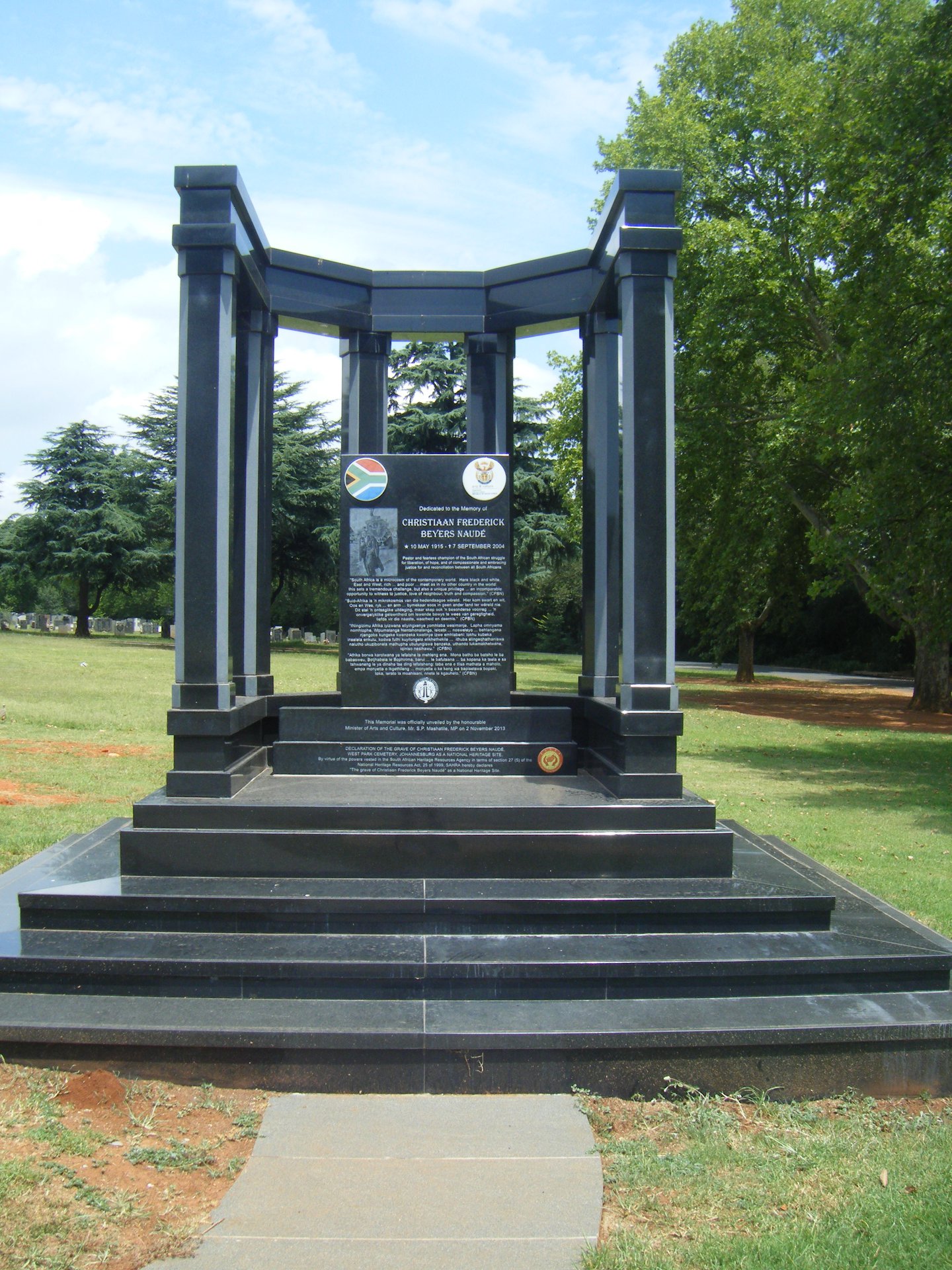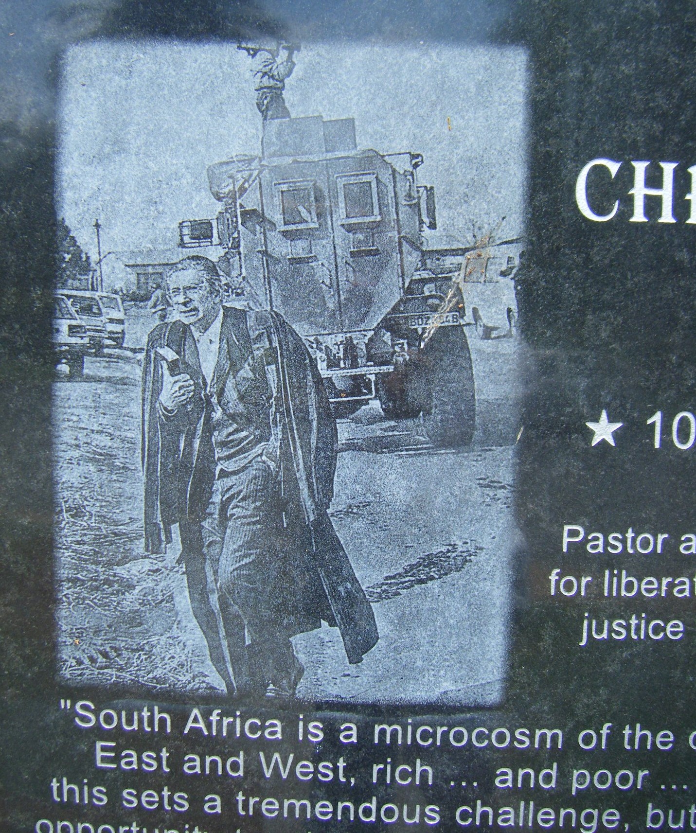 This is the memorial to Beyers Naude close to the entrance of West Park Cemetery in Heroes Acre. If you visit here, read the inscriptions behind as well. Beyers Naude Drive, which separates Melville Koppies Central and West, is a major Joburg arterial road, named after a man of peace, Beyers Naude. 'Oom Bey' as he was affectionately known, was a senior cleric in the Dutch Reformed Church (DRC) and was also dominee of the Aasvoelkop congregation in Northcliff. He came to believe that apartheid could not be justified by the scriptures. As an anti-apartheid activist, he then came into conflict with the DRC which upheld the National Party Government's policy. In 1963, at a historic service in his Aasvoelkop church, in slow measured tones, he condemned apartheid as a crime against humanity. For this, he was defrocked, excommunicated and his family ostracised by his Aasvoelkop congregation. Beyers Naude then started the Christian Institute (CI), a multicultural, ecumenical organisation focused on improving interracial communication by, inter alia, Bible study groups. I belonged to such a group. We always had members of the security police sitting in cars on the street outside, keeping watch on our 'subversive' meetings. ![]() This photo was probably in Die Beeld, perhaps taken in 1986 during the state of emergency. Beyers Naude, armed with a bible and his clerical robes, is seen anxiously striding in front of a casspir. It may have been in Alexandra, where Beyers Naude was joint pastor of a church with Rev. Sam Buti. The photo is on the memorial. The CI was banned in 1973 because it was 'upsetting the social order in SA'. Beyers Naude, because of his activism, was placed under house arrest for seven years. This meant he could only have one visitor at a time with only two people present, so his family would have to wait in another room during such visits. In due course, the DRC apologised to Beyers Naude. In recognition for his service to SA, D.F. Malan* Drive was renamed Beyers Naude Drive in 2001.