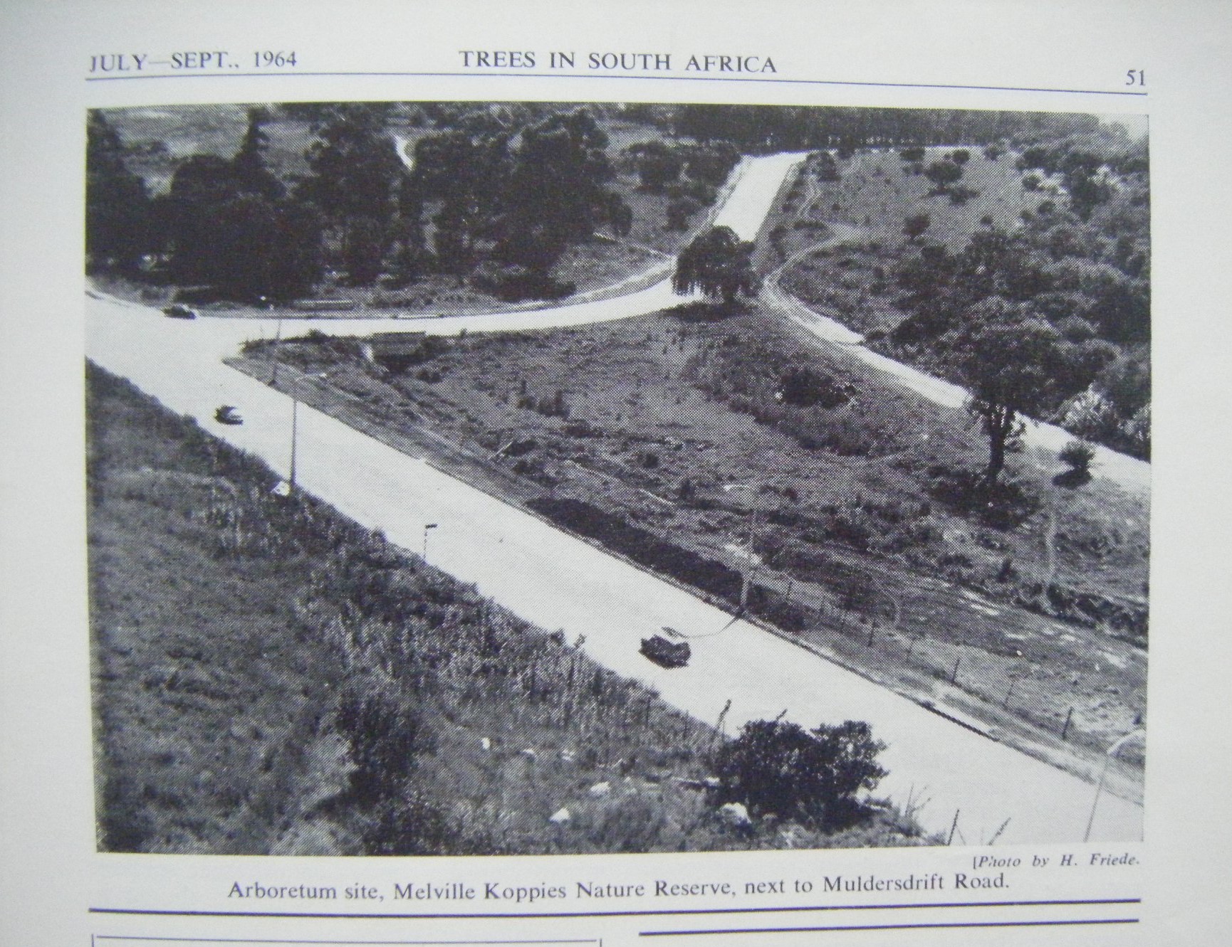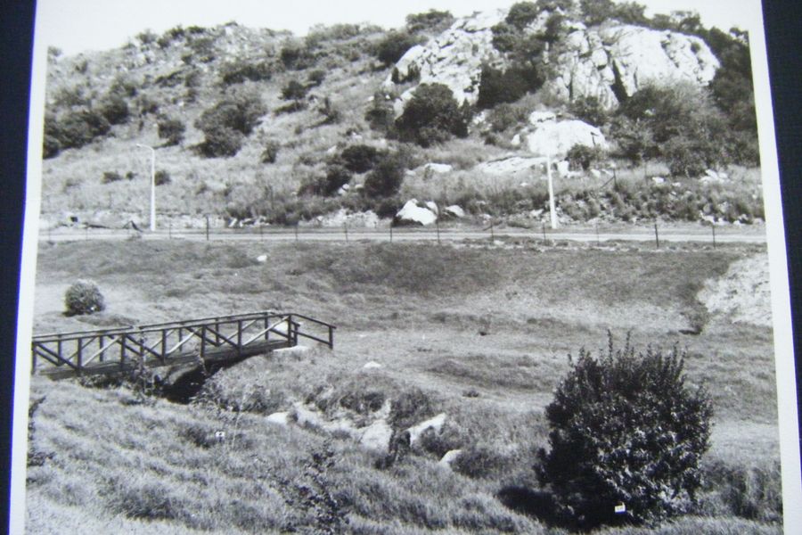 The rustic wooden bridge with the newly built D.F Malan Drive (now Beyers Naude Drive) in mid picture. The 'Cave' is in the outcrop of rocks above the Drive. The grassy area around the bridge is now a planted indigenous forest - the arboretum.