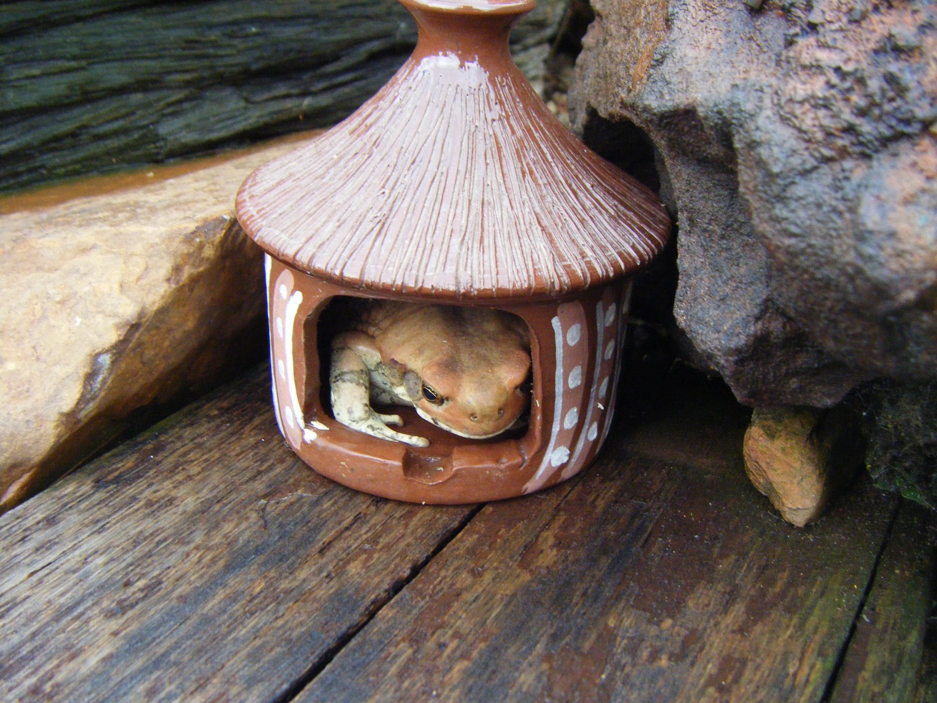 The red toad secure in its pottery hut. It was facing the other way when Michelle curiously poked it gently with her finger. 'EEEK! It moved!' This was Michelle de Villiers' reaction when she poked something soft and squishy in a little pottery hut, part of an assortment of pottery patio projects donated to Michelle's JUNKIE Charity shop.* The squishy thing was a delightful Red Toad (Schismaderma carens) which had squashed itself into the little hut. We first tried re-homing it at Lynne and Cavan's eco-friendly pool, but were concerned that it might get zapped by the electric fencing if it decided to cross over into the adjacent Melville Koppies Central. Therefore, as toads live in grasslands, we took it directly to Melville Koppies Central where it immediately emerged from the pottery hut and disappeared into the undergrowth.