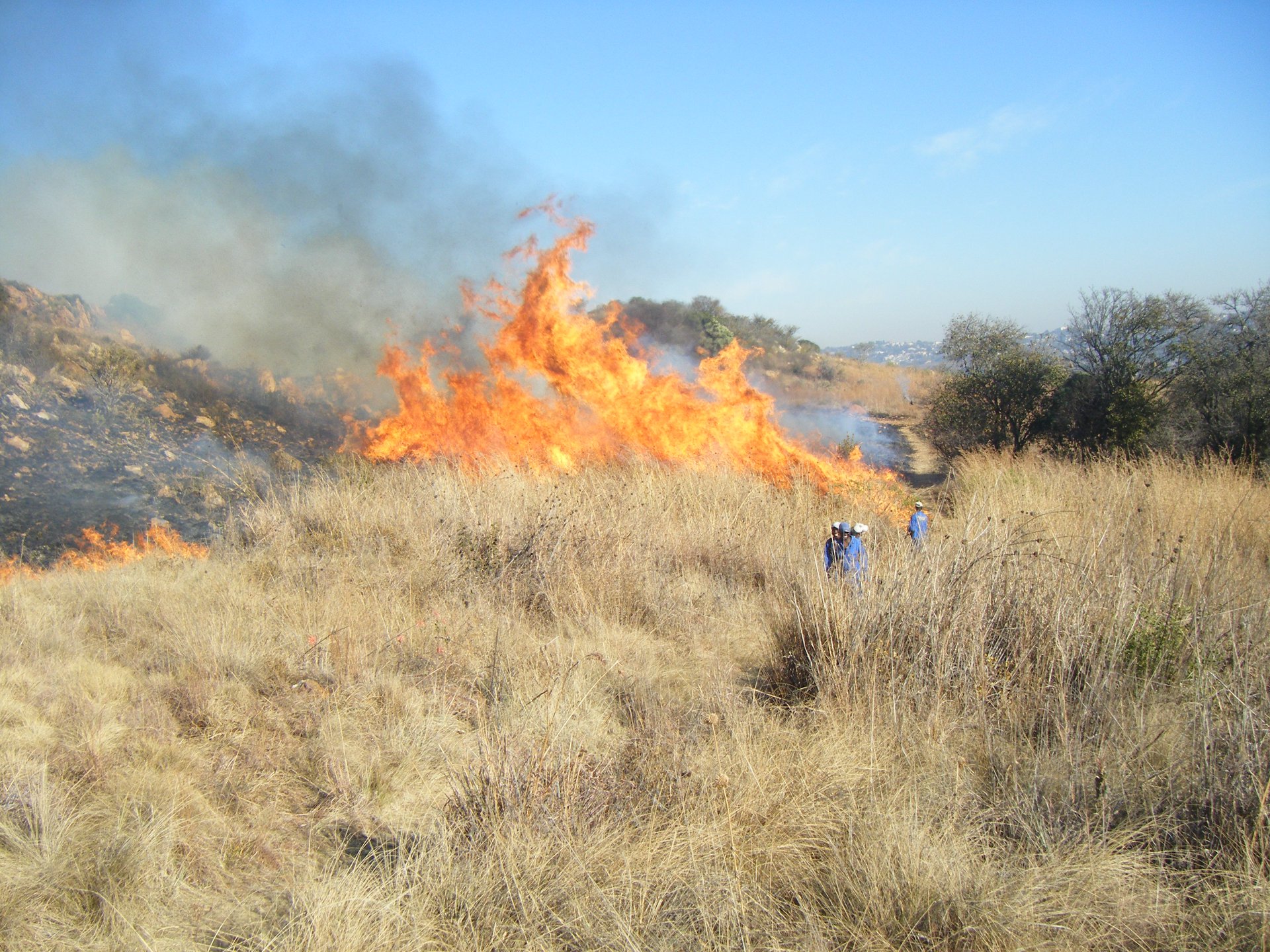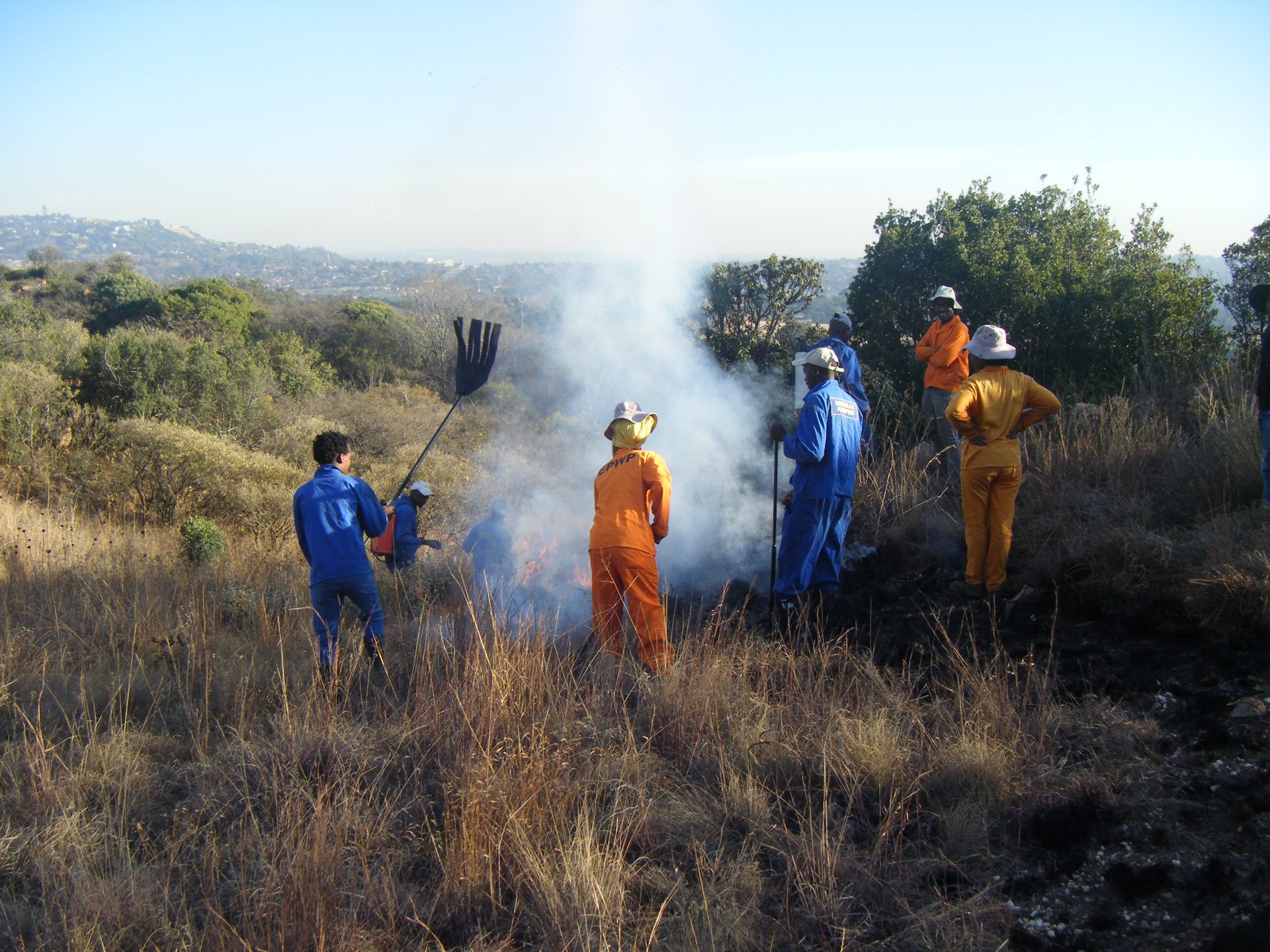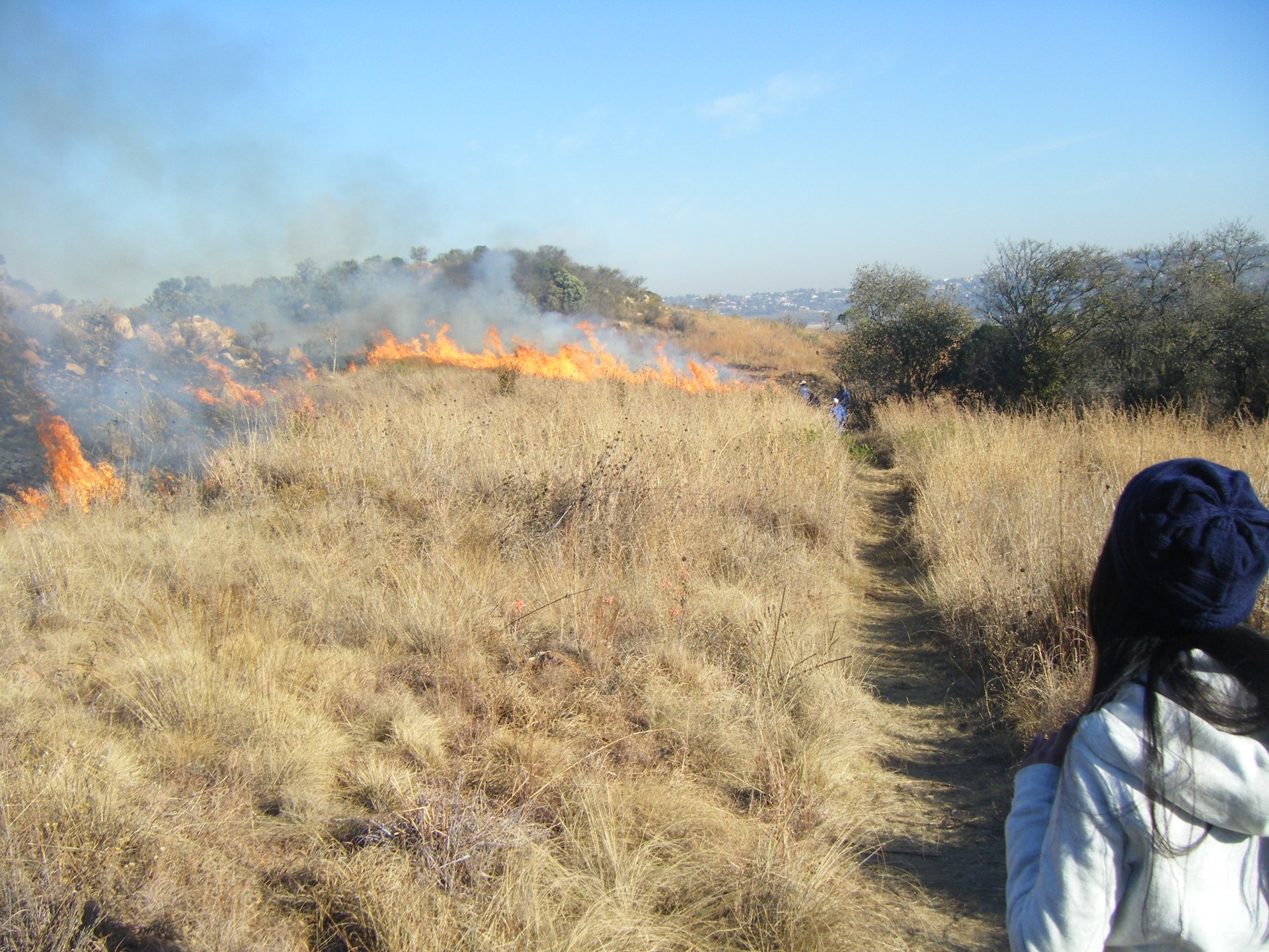 The 2015 burn of the thatch patch. The EPWP workers were assigned to us for a few months so they helped with the burn, including toting the 5L containers of water. Here they are busy burning the firebreak. I have always seen myself as slightly adventurous, but not a complete daredevil. Motherhood has ironed-out most of these confront-your-fear cravings that one has in one's twenties. Nowadays, I get my heart beating and the blood pumping pretty quickly when we block-burn areas on Melville Koppies. Every two or three years, or as necessary, the conservation team burns a patch of two-metre high Blue thatching grass (Hyparrhenia tamba) on a shallow saddle along the top ridge. It is encircled by the stones of an early farmer's kraal, and has a very special little tree in its midst, the Vlieebos (Otholobium polystictum) that manages to emerge and flower in the following season. First task, as the sun starts to burn off the frost, we burn a five-metre firebreak around the thatch patch. Our brave, very experienced guys dressed in cotton protective gear, have 16L spray backpacks which need refilling every 15 minutes or so. Wendy and I do a boring but essential job of trotting back and forth carrying 5L containers from the tap a hundred or so metres away. All in all, a good two hours of early morning exercise!