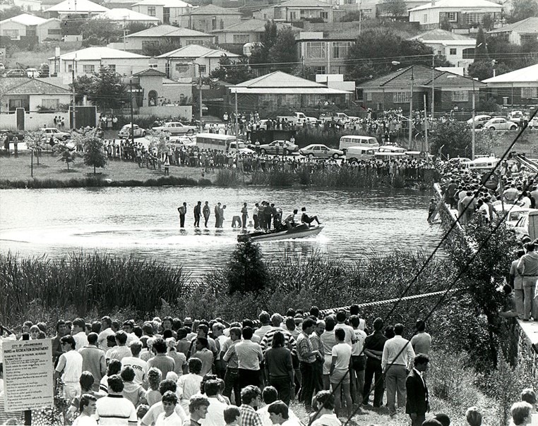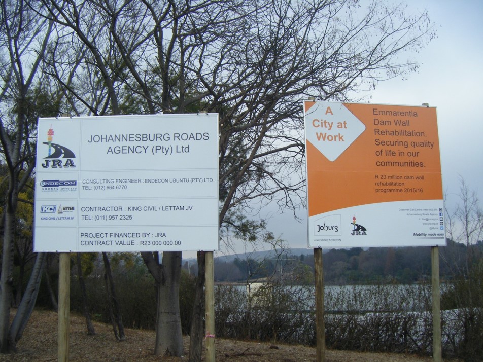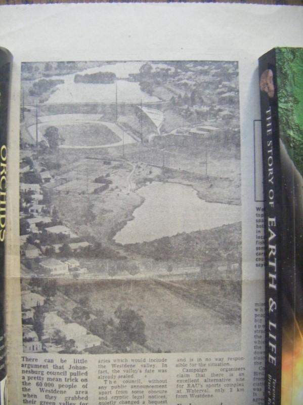 The tragic Westdene bus disaster, when a bus filled with schoolchildren plunged into the dam. There is a memorial to these children in Heroes Acre at West Park. The run-off of rain water from Melville Koppies West is reduced because the veld acts like a sponge, soaking up much of it. But then, alarmingly, the run-off into the WS is hugely augmented by humans' developments upstream and this severely reduces the attenuation of storm water. In 1975, RAU's (Rand Afrikaans University - now UJ) sports fields were built on the wetland adjacent to Beyers Naude Drive. This wetland had been an important soak for floodwaters. ![]() Another photo from The Star 9th October 1975 with Paddadam in the foreground. There was a huge outcry at the loss of this dam, but more importantly, the loss of the wetland below. Tons of rubble were dumped on the wetland. Sadly the value of wetlands was not understood back then. After 2000, the Campus Square shopping centre replaced UJ's 50m swimming pool and its grassy surrounds. The Boulevard shopping centre replaced Melville's municipal 50m pool with its grassy surrounds. Paved drive ways and choc-a-bloc housing developments in Melville and Westdene exacerbate the run-off. The result is that after freak thunderstorms, the water collects in a maelstrom and then punches its way through the twin bridge tunnels under Beyers Naude Drive - into Melville Koppies Central - scouring its WS banks. From Central, the WS feeds into the top, middle and Emmarentia Dams, flows over the weir at the canoe club, meets up with the Montgomery Spruit just before Tana Road and then both meet the Braamfontein Spruit at Delta Park - on their way ultimately to Xai Xai in Mozambique. A long journey for a little drop of water! Day 31: The Dam wall Wendy Carstens In the 1880s, the Geldenhuys brothers bought the farm 'Braamfontein', which included Melville Koppies, to prospect for gold. They found no payable gold. They then turned to farming in the richer soils north of the Koppies - present day Marks Park, the Botanical Gardens, Emmarentia,* Linden, etc. They irrigated their fields with water from the Emmarentia Dam which they had constructed at a cost of 12 000 pounds in 1905. The dam wall was built with rocks rolled down from Melville Koppies - that is why there is a dearth of big rocks on the northern slopes. They must have removed much of the stone walling of the early farmers. By 2015, the dam wall needed major repairs. At a cost of R23m the dam wall and Olifants Road underwent major repairs and improvements. Additional construction below Olifants Road was for flood control. The dam wall should last another century! * Louw Geldenhuys' wife was Emmarentia; Frans Geldenhuys' wife was Judith. Day 32: 'Stinky Stuff' Tamarin Scheidegger
