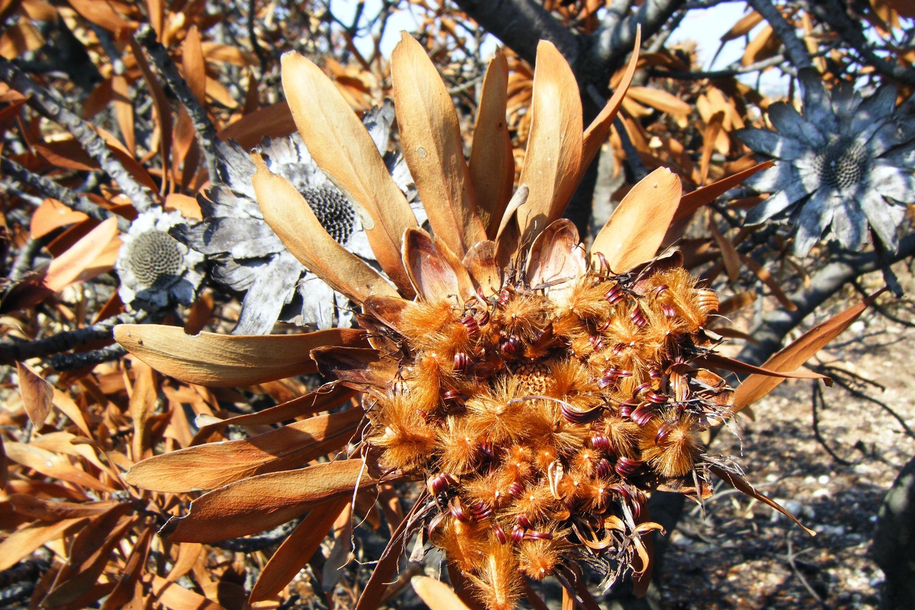 This summer rainfall Protea caffra is not the species of our national flower. The winter rainfall King Protea is the species on one of our coins. The roots of the aloe that grow on the Koppies (Aloe greatheadii) are miniscule by comparison. But rarely does it die in a fire. Dead leaves at its base insulate its roots from the heat while its fat, moisture-filled inner leaves are its fire extinguishers. The Protea caffra, which is found on the Koppies, is a smallish tree just tall enough for the crown of leaves that makes its food escape most grass fires. Its chunky, corky bark is like a fireproof jacket that protects the vital vessels that transport food and water up and down between its roots and leaves. But its real secret weapon against fire is in its seeds. It flowers in November/December. Dropping fertilised seeds at the end of autumn would be silly when it still has to endure cold winter frosts and possibly winter fires. Instead, once its great flower head has been fertilised, the outer bracts come together and close up into a hard spherical shape. There they stay, sometimes for more than a year. If there is a fire, the heat and the smoke from the fire will crack open the sphere and fertilised seeds will burst open leaving a golden fluffy carpet on the ground below. Cleared of all grass and other bulky plants by the fire, the fluffy-jacketed Protea seed can now sit it out until rain falls when it can root itself and start another Protea tree. Day 38: Hedgehogs Jenny Grice