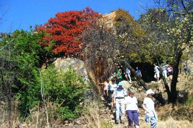 In spring the new leaves of the Ficus Ingens come out in a bold display of red. Here walkers pass below the cliff where the cave is. The tree with the cream flowers is the Wild Pear (Dombeya rotundifolia). Photo: Wendy Carstens At its foot is a small cave in which Late Stone Age artefacts were found, together with bones of game hunted and killed by the people who used it. Above the cave and along the cliff grows a very old Ficus ingens known sometimes as the Red-leaved fig, the rock-breaker, or in Afrikaans the Rotsbreker