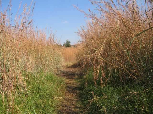morning you have to fight your way through it, and emerge drenched. Most of it is grassland, and at least 25 of the 56 recorded grass species can be readily identified in summer; some are more elusive. The southern extremes are dominated by Blue Thatching Grass (Hyparrhenia tamba). In late summer this grass grows to stands of 3 metres in height, and when it burns is truly terrifying. The southern slopes were dominated by stands of Australian Black Wattle - a category two invader in South African law. These were felled in 1994, but the follow-up is arduous, and the wattles leave a devastated landscape behind. Not only do they leave a huge seed bank, but the supposedly dead stumps manage to send out runners which sprout new saplings. It has taken years to subdue the regrowth and to control the opportunistic weeds which moved in.